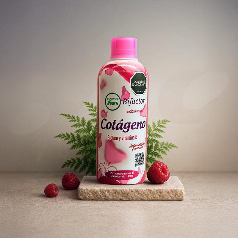 Bifactor Colágeno regenera tejidos, ligamentos, tendones y cartílagos, facilita la cicatrización, mejora la resistencia y elasticidad de la piel, favorece el crecimiento del cabello y uñas, retrasa el envejecimiento y protege las células del daño oxidativo, siendo efectivo para enfermedades degenerativas de huesos, venas várices y cuidado integral de piel, cabello y uñas.
