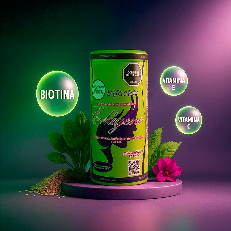 Bifactor Colágeno regenera tejidos, ligamentos y cartílagos mientras mejora la apariencia de la piel, fortalece el cabello y las uñas. Su fórmula enriquecida con vitaminas E, C y biotina acelera el metabolismo, facilita la cicatrización y proporciona potente acción antioxidante que retrasa el envejecimiento celular y protege contra el daño oxidativo.