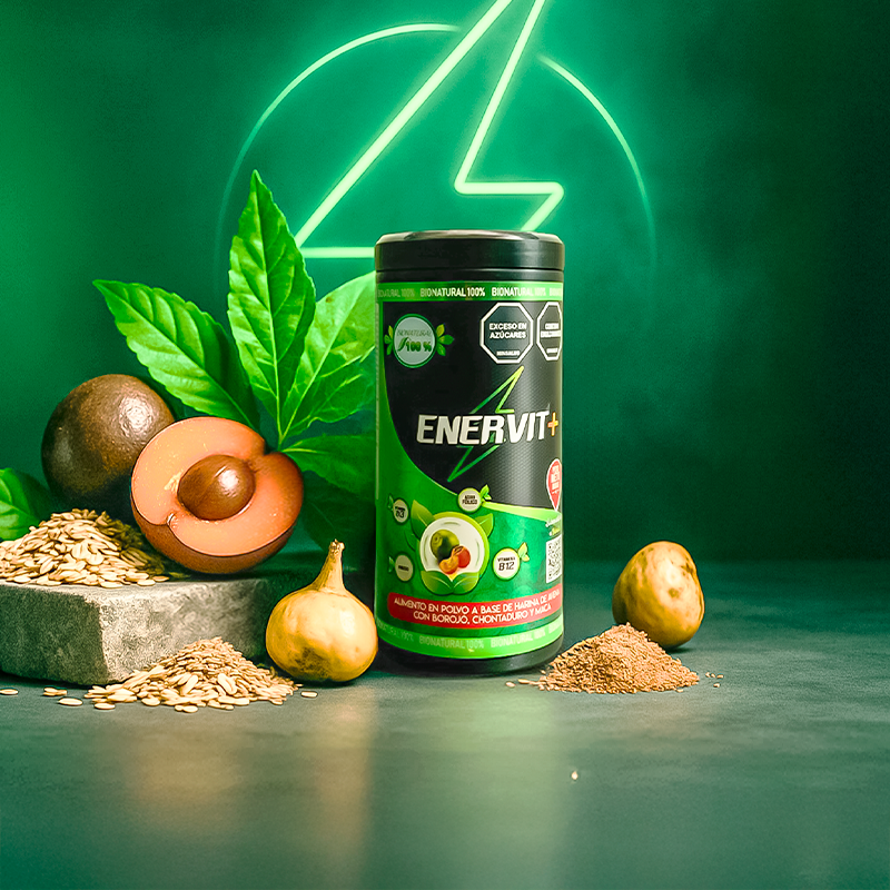 Enervit es un suplemento natural en polvo que combina borojó, chontaduro, maca y vitamina B12 para combatir la fatiga física y mental, aumentar la energía y vitalidad, mejorar el estado de ánimo, potenciar el deseo sexual y optimizar el rendimiento deportivo. Ideal para personas con agotamiento, deficiencias nutricionales o que buscan mejorar su bienestar general de forma natural.