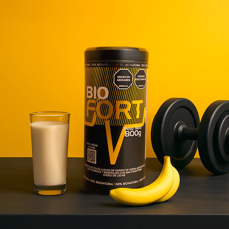 Bio Fort es un suplemento proteico de alta calidad que combina proteínas de avena, soya, suero de leche y huevo con maltodextrina para promover la síntesis de proteínas musculares y apoyar la recuperación después del ejercicio. Este producto está especialmente formulado para personas activas, deportistas y quienes buscan desarrollar masa muscular, proporcionando nutrientes esenciales que favorecen el crecimiento y mantenimiento muscular, siendo ideal tanto para consumir después de las comidas principales como antes de iniciar la actividad física.